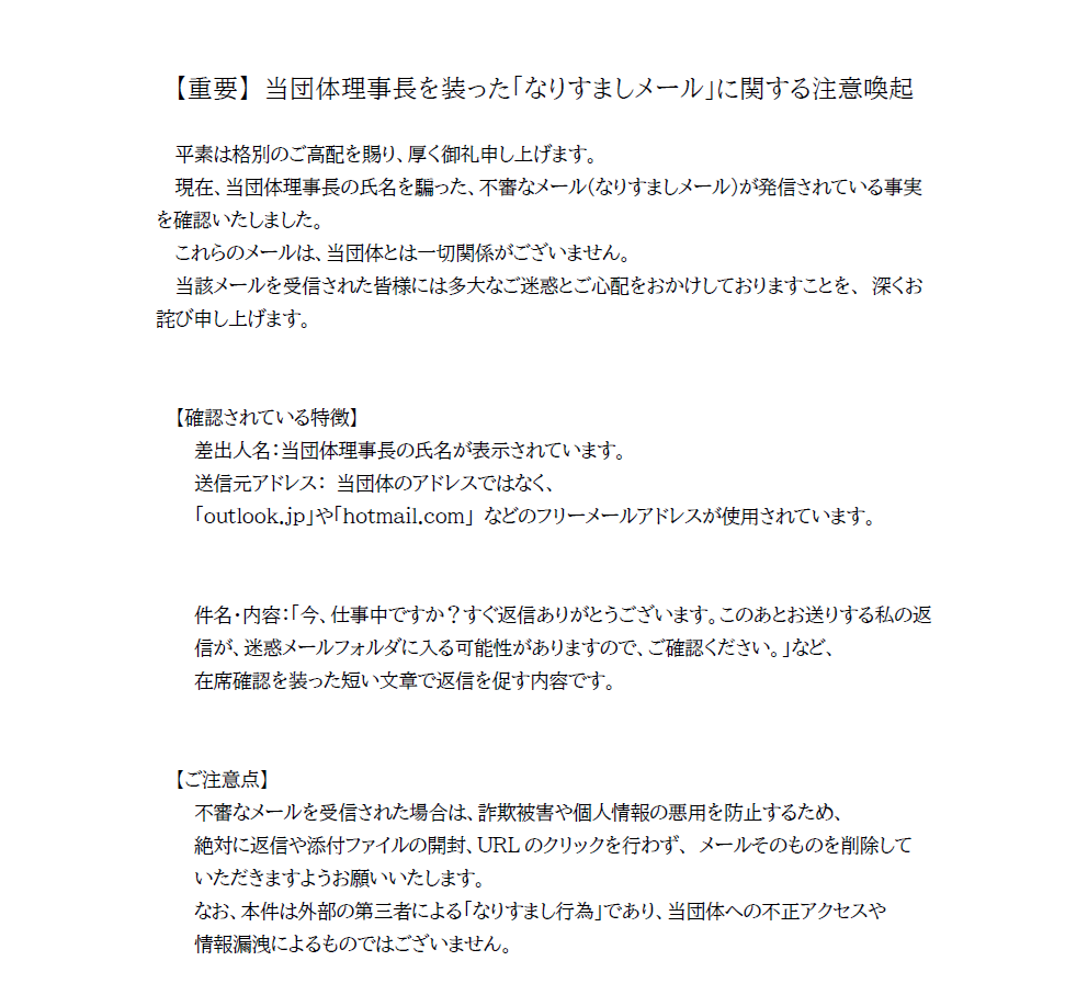 【重要】 当団体理事長を装った「なりすましメール」に関する注意喚起