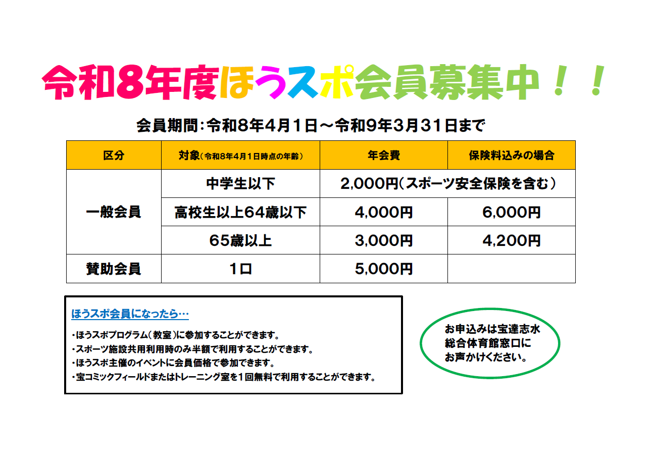 お知らせ 令和8年度宝スポ会員募集 2026.04.10 【宝スポ会員募集のお知らせ】 令和8年度の宝スポ会員を募集しております! 体を動かして、楽しくリフレッシュしませんか? 初心者の方も、経験者の方も、大人も、子供も大歓迎です。 誰でも気軽に参加でき、楽しく汗を流しながら、健康づくりや仲間づくりをしましょう! 見学・体験もできます!お気軽にお問合せください。 Tweet シェア 2026桜ウオーク